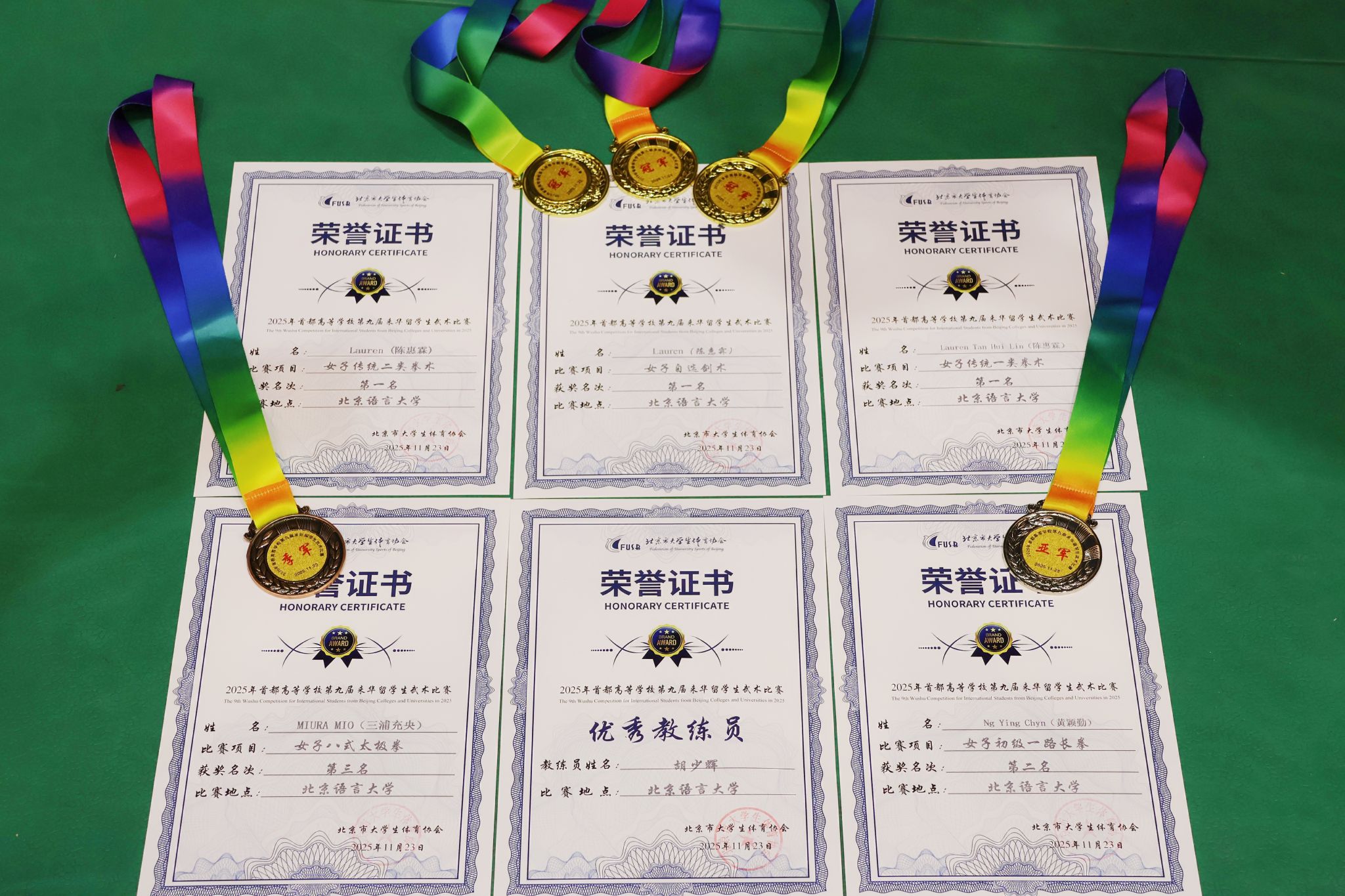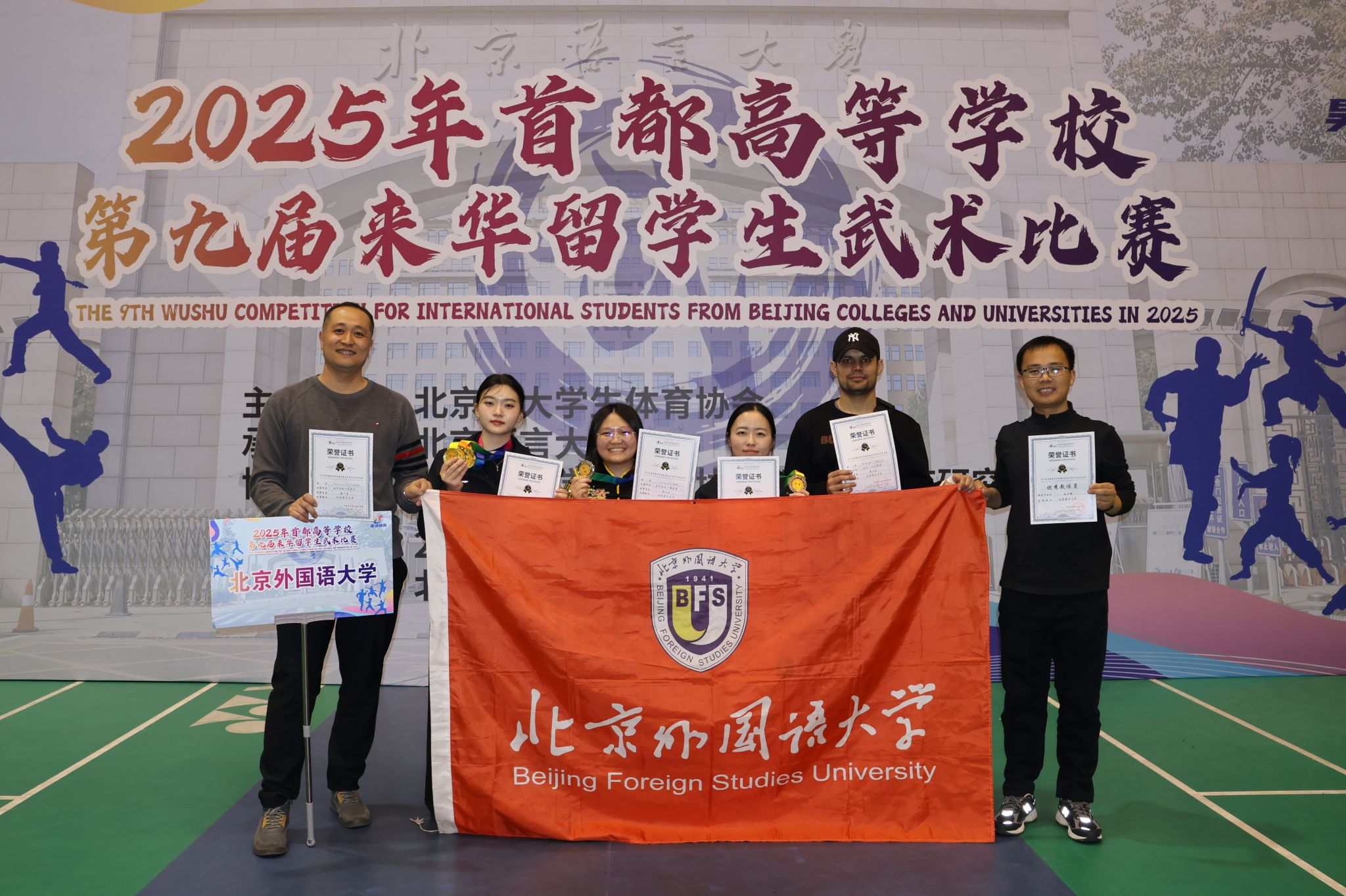 On November 23, 2025, the 9th Wushu Competition for International Students from Beijing Colleges and Universities in 2025 was successfully held. The BFSU delegation was led by Kailin from the Overseas Students Affairs Office, with Hu Shaohui from the Department of PE and Research serving as the coach. After heated competition, the BFSU delegation ultimately secured three gold medals, one silver medal, and one bronze medal in individual events. Hu Shaohui was awarded the title of “Excellent Coach,” setting a new record for BFSU in this competition.