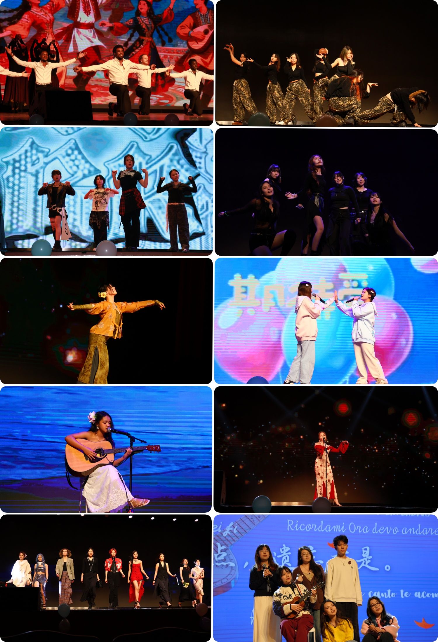 The gala unfolded across four thematic chapters: "Encounter: Tracing the First Light", "Interweaving: Fireflies in a Ring", "Continuity: Resonance in the Night", and "Reflection: A Perfect Closing Circle", with spectacular performances following one another in seamless succession. In the Encounter chapter, a band’s rendition of "American Idiot" instantly fired up the audience, while "Barlang, Let’s Dance!", performed jointly by 20 Chinese and international students, showcased exotic flair. Malaysian and Filipino students delivered moving performances of "Burning Rose" and "If It Rains Afterwards," conveying delicate and heartfelt emotions. The Interweaving chapter featured musical theatre pieces such as "March Women March," "Fumo Fumo," and "Can’t Take My Eyes Off You," alongside collaborative performances including "New Dance" and "Time Thieves," all earning enthusiastic applause. In the Continuity chapter, an Azerbaijani student’s performance of "The Divine Maiden Splits the Scene" captivated the audience. A song medley of "Twenty Three" and "Expect Love," the classical dance "Gilded Moon," and the timeless "Nothing’s Gonna Change My Love for You" followed in turn, while the encore "Insane" pushed the atmosphere to its peak. The Reflection chapter reignited the spirit of rock with "Rock and Roll" and "Get Back," touched hearts with "Goodbye Gougou," energized the hall with the Japanese dance "Mamma Mia!", and concluded with the entire audience singing "Remember Me," bringing the evening to a memorable close.